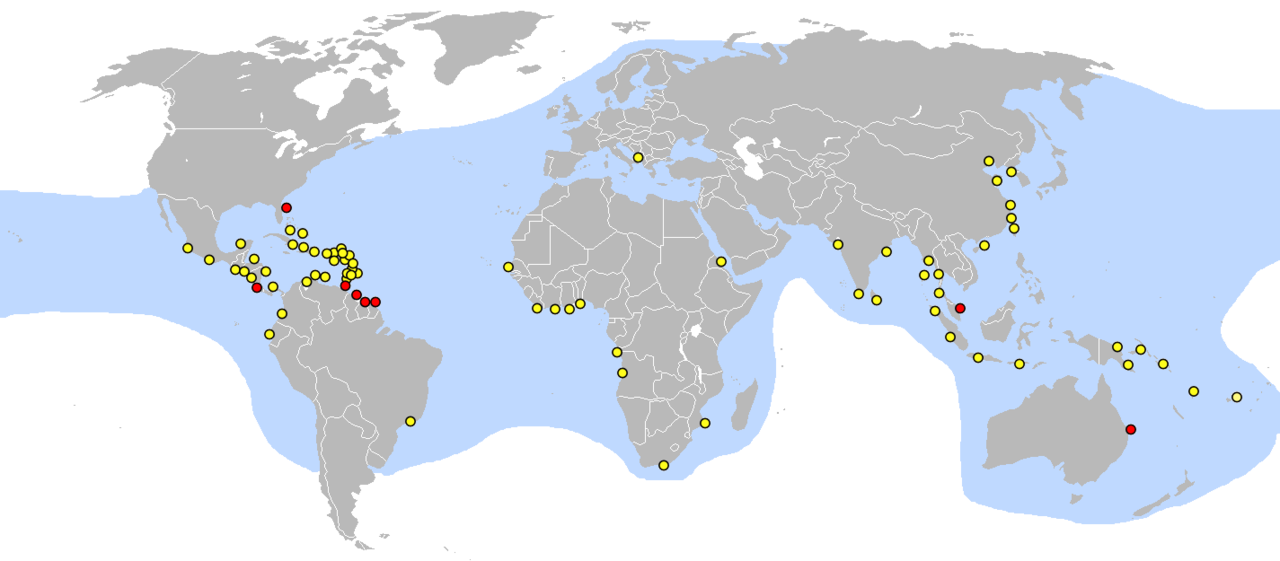 태평양, 대서양, 인도양 등의 열대, 아열대 바다. 드물게 대한민국의 서해, 남해에서도 산다.